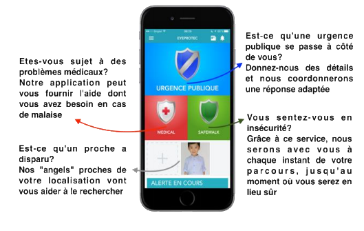 La société de sécurité EyeProtec fournit un service d’aide 24h/7j via une application permettant d’alerter rapidement les services d’urgence, mais aussi des volontaires « Angels », localisés à proximité et pouvant intervenir immédiatement.