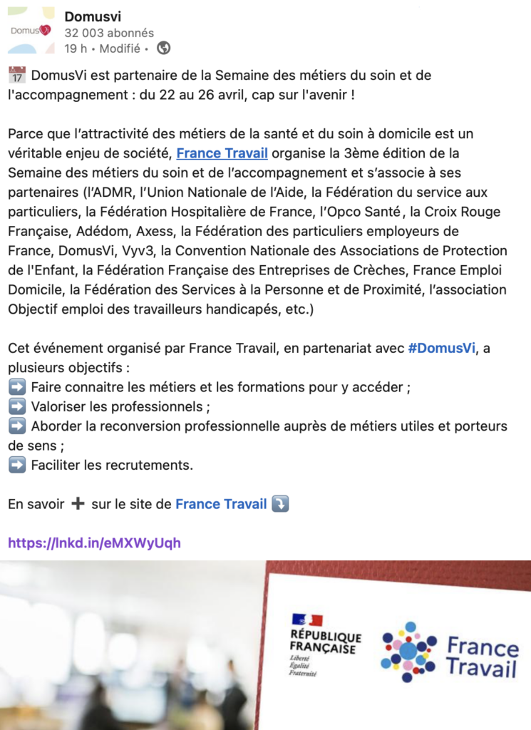 Au regard de l’enjeu de société qu’est devenu l’attractivité des métiers de la santé et du soin à domicile, France Travail organise avec ses partenaires cette troisième édition de la semaine des métiers du soin et de l’accompagnement. La liste de ses associés est longue :