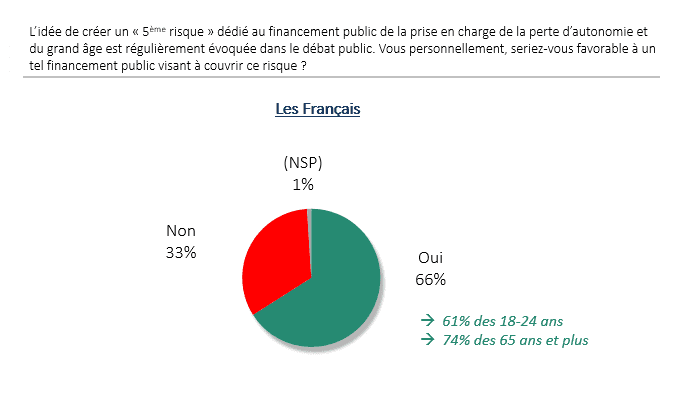Enfin, les deux-tiers des Français sont pour la création d’un « 5ème risque » dédié au financement public de la prise en charge de la dépendance et de la vieillesse.