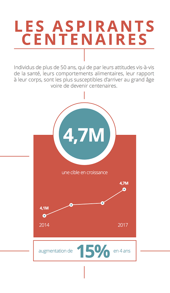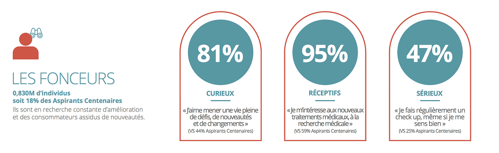 Selon l’étude, il existe un groupe de cinquantenaires et + en croissance qui montrent des comportements et des attitudes spécifiques et marquées vis-à-vis de la prise en charge de leur santé et de la vie en général. Ils agissent clairement dans une perspective de « vivre le plus longtemps possible et en meilleure santé possible » : les Aspirants Centenaires.