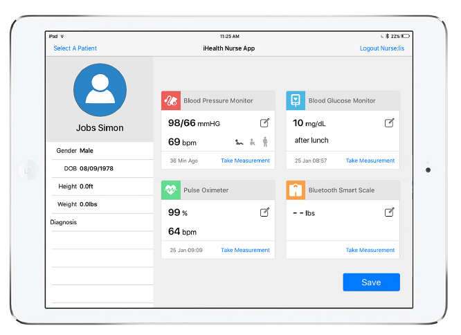 Les applications, entièrement modulables par les équipes iHealth, permettent aux professionnels de santé et principalement aux infirmières, de gagner du temps en prenant les mesures des patients avec les dispositifs médicaux iHealth. Chaque mesure est automatiquement envoyée sur le profil du patient.