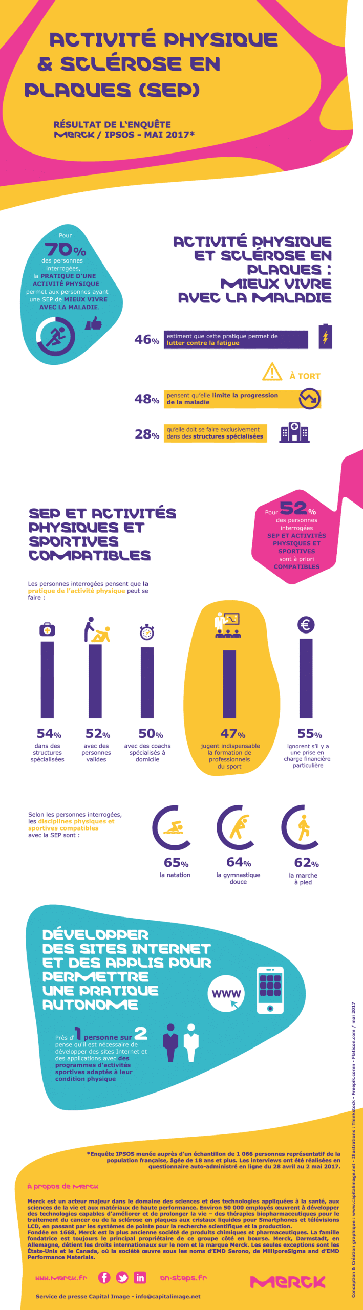 A l’occasion de la Journée mondiale de la sclérose en plaques, qui se tient ce mercredi 31 mai 2017, une enquête Ipsos/Merck révèle que pour 1 Français sur 2, activité physique et sclérose en plaques sont compatibles et que 70% des Français déclarent que la pratique d’une activité physique permet aux personnes ayant une sclérose en plaques de mieux vivre avec la maladie.