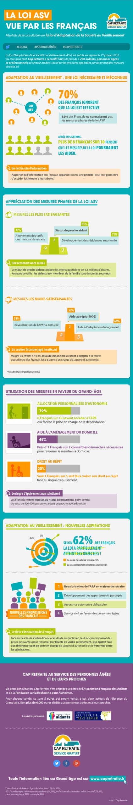 Cap Retraite, qui a lancé au printemps une consultation solidaire autour de la loi ASV aux côtés de l’Association Française des Aidants et de la Fondation pour le Recherche sur Alzheimer, publie aujourd’hui les résultats de cette consultation ainsi qu’une infographie intituluée « La loi ASV vue par les Français » que nous relayons sur silvereco.fr.