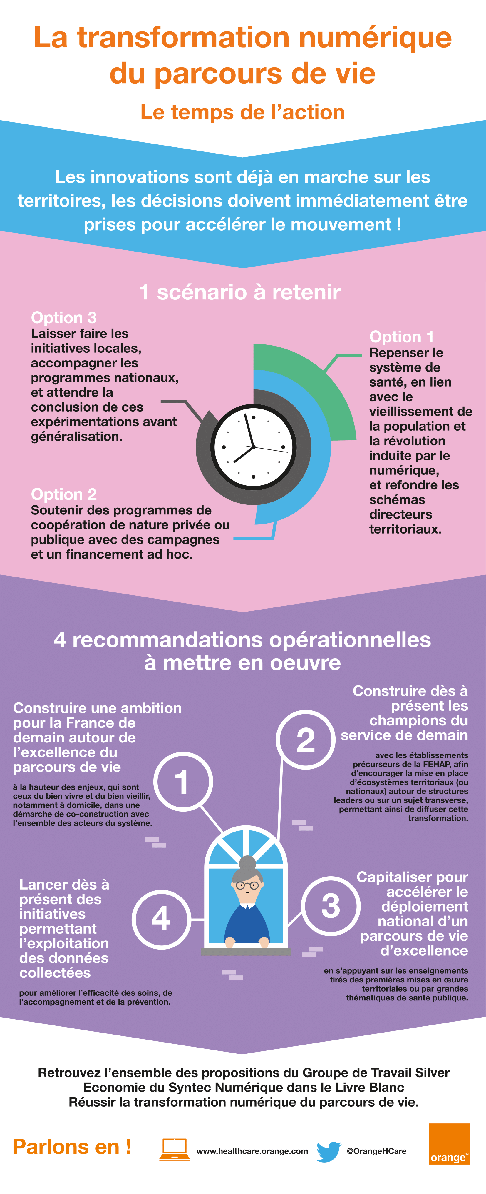 A l’occasion du 40ème congrès de la Fédération des Etablissements Hospitaliers et d’Aide à la Personne privés à but non lucratif, Orange Healthcare et la FEHAP pont présenté le livre blanc Réussir la transformation numérique du parcours de vie de Syntec numérique et de la FEHAP. Voici un résumé sous forme d’infographie.