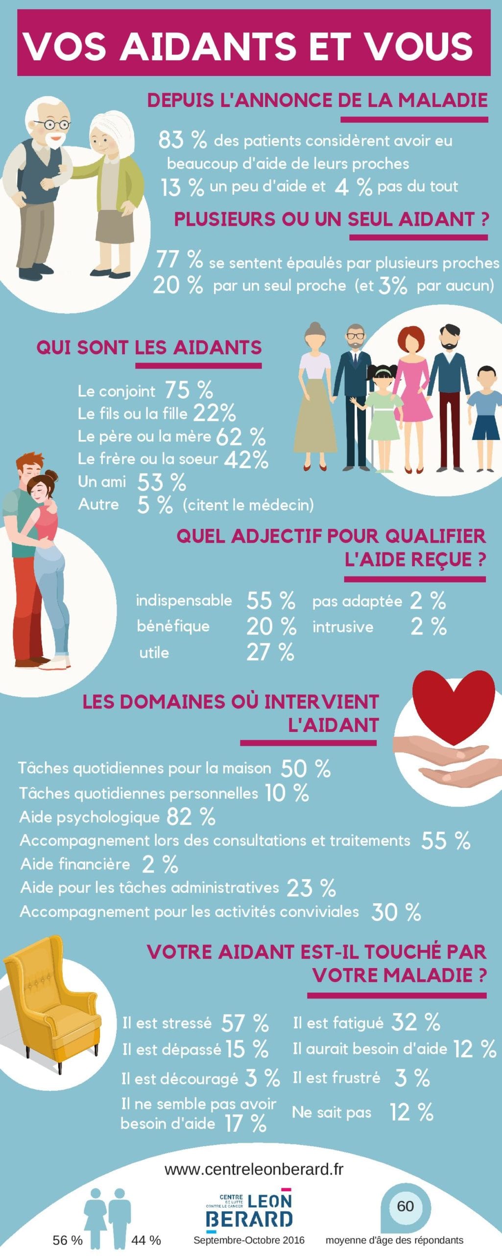 Dans le cadre de son opération « Léon s’interroge », le centre de lutte contre le cancer Léon Berard a réalisé une infographie sur les aidants des patients atteints de cancer, afin de mieux comprendre leur rôle dans la maladie. L’enquête a été réalisée en 2016 et la moyenne d’âge des personnes interrogées était de 60 ans (56% d’hommes et 44% de femmes).