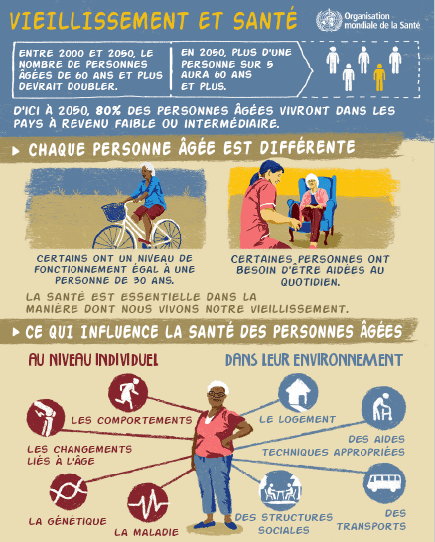 L’OMS (Organisation Mondiale de Santé) a communiqué sur les principaux faits et chiffres liés au vieillissement de la population et à la santé via une infographie.