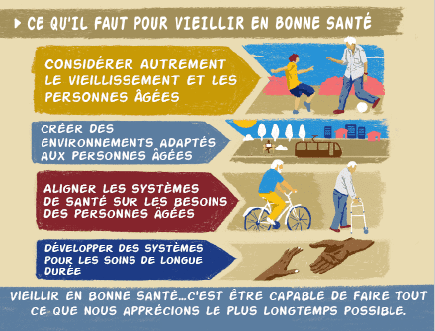 Cette dernière retrace les facteurs influant sur le vieillissement en bonne santé, quelques conseils pour vieillir en bonne santé ou encore les principaux défis face au vieillissement de la population.