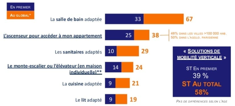 En effet, les solutions de mobilité verticale (par le biais d’un ascenseur pour un appartement ou bien d’un élévateur ou monte-escalier pour une maison individuelle) sont leaders lorsqu’il s’agit du 1er choix, avec un total de 39%. S’en suivent la salle de bain adaptée pour 33% des Français, puis les sanitaires adaptés pour 10% d’entre eux.