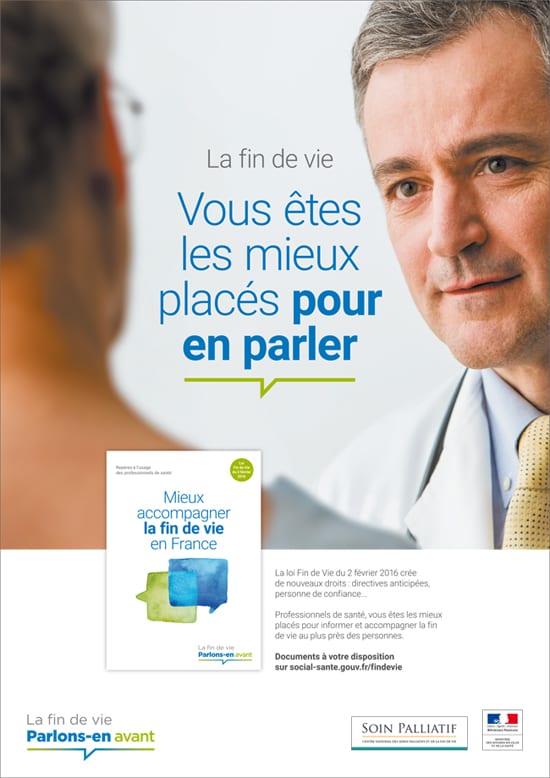 La signature de la campagne met l’accent sur l’importance d’aborder le sujet de la fin de vie, sans attendre de tomber malade. La signature souligne le caractère essentiel du dialogue entre le professionnel et son patient.