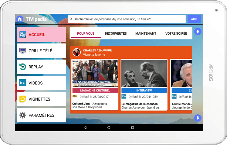 Grâce à la tablette Ardoiz©, les utilisateurs profitent d’une expérience télévisuelle enrichie avec, notamment, la possibilité de regarder les rediffusions de leurs émissions préférées. Ils bénéficient en outre, grâce au partenariat avec l’Institut national de l’audiovisuel, d’un accès sur Ardoiz© gratuit et illimité sans publicité, au patrimoine audiovisuel unique de l’INA, à travers près de 70 ans de vidéos mythiques et inoubliables.