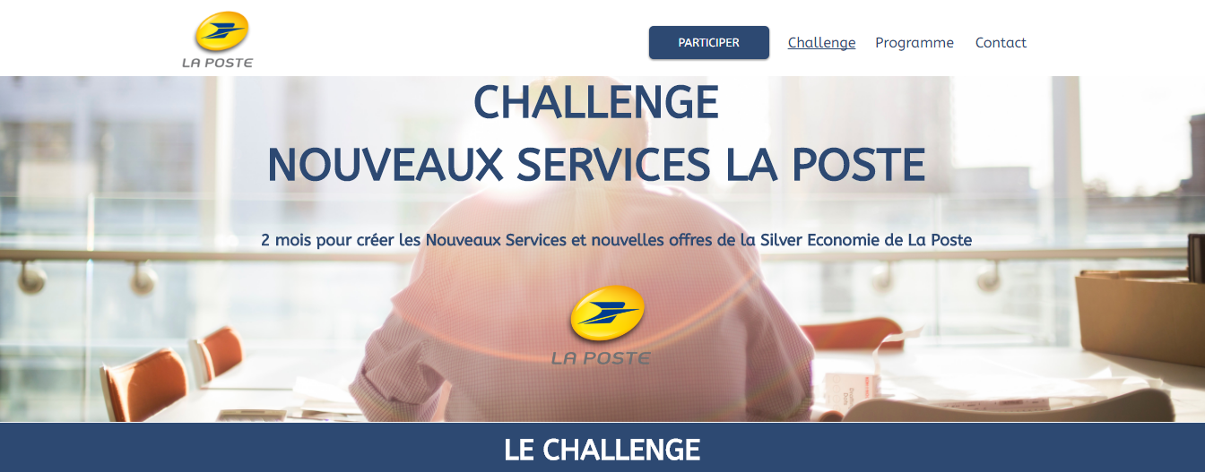La Poste lance un appel à projets pour un challenge en ligne de 2 mois (du 6 avril au 8 juin 2017), pendant lesquels les startups seront accompagnées via un coaching personnalisé, et auront accès à la base de données du groupe afin de créer de nouvelles offres dédiées aux seniors.