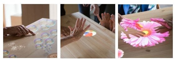 Éclater des bulles de savon, faire pousser des fleurs, jouer avec un ballon de plage ou ramasser des feuilles d’automne font partie des 8 jeux de base de la Table Magique testés par les résidents.