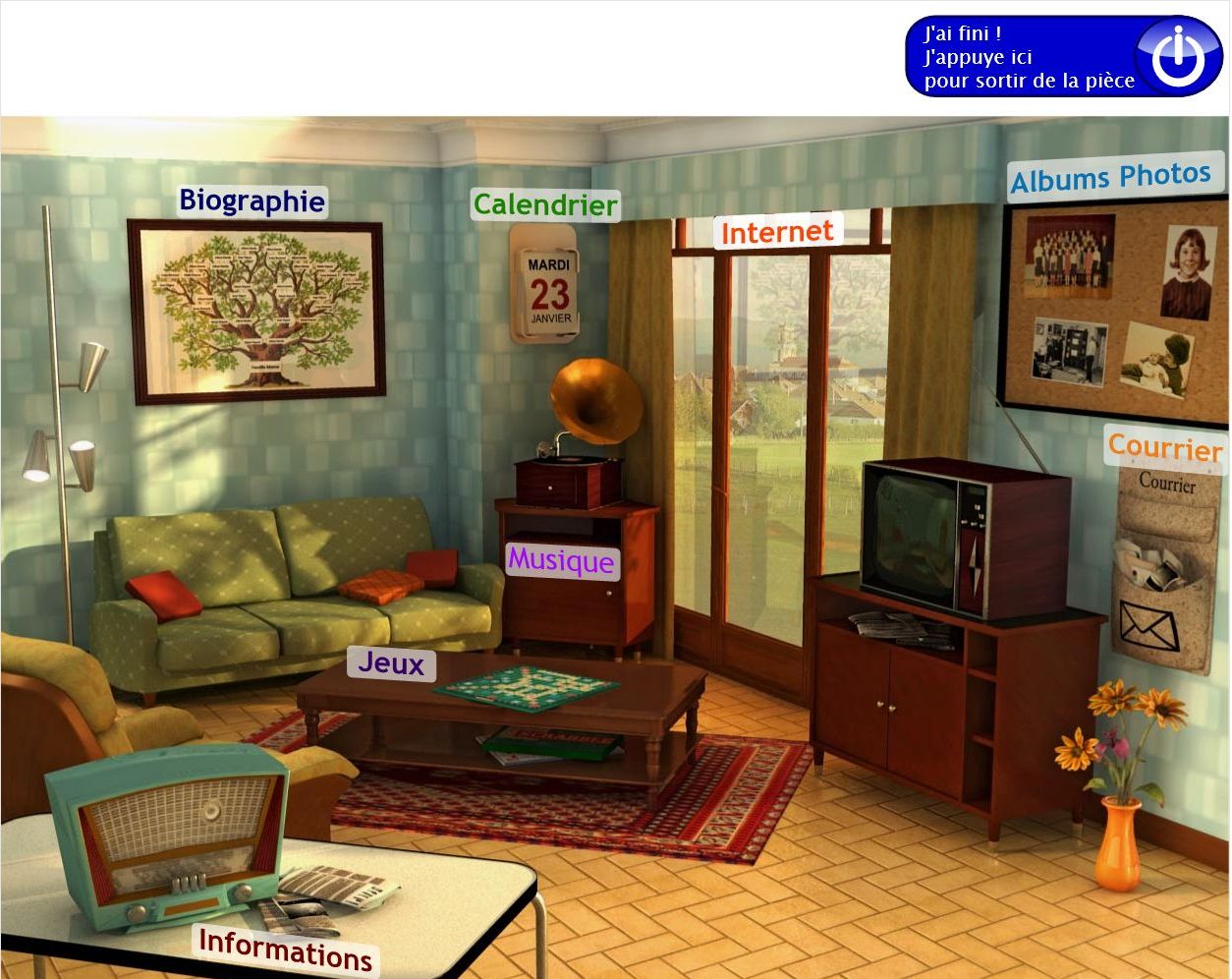 Avec l’aide de l’animateur la personne âgée accède à son espace personnalisé, ce dernier est conçu pour l’aider à retrouver ses repères spatio-temporels et identitaires. Il lui est alors possible de visionner sa Biographie sous la forme d’un Album photo, d’écouter de la musique, de recevoir des messages de ses proches et même d’accéder à Internet.