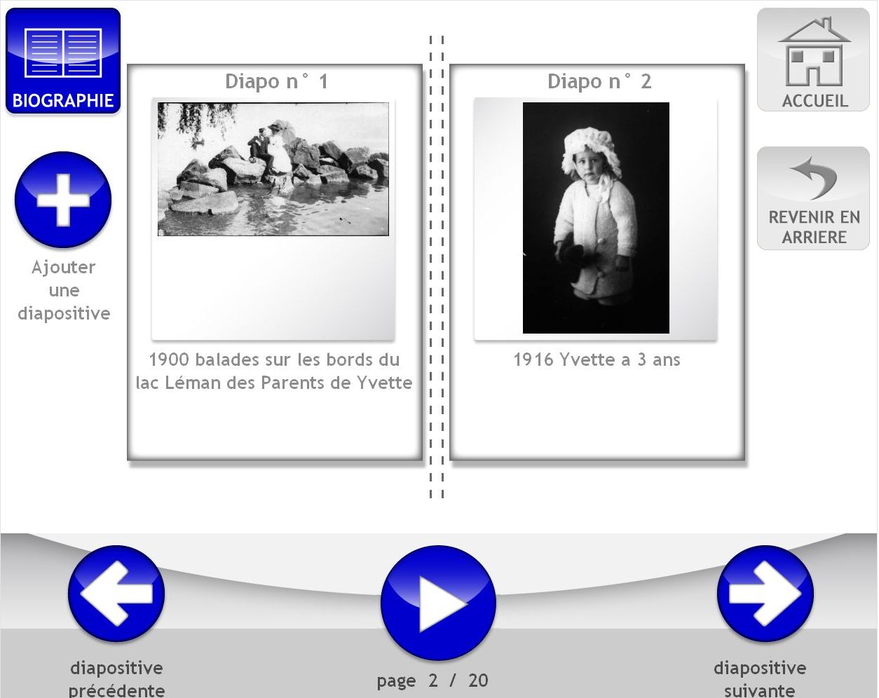 Avec l’aide de l’animateur la personne âgée accède à son espace personnalisé, ce dernier est conçu pour l’aider à retrouver ses repères spatio-temporels et identitaires. Il lui est alors possible de visionner sa Biographie sous la forme d’un Album photo, d’écouter de la musique, de recevoir des messages de ses proches et même d’accéder à Internet.