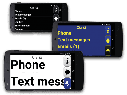 Une fois installée, Claria devient le nouvel écran d’accueil du téléphone. L’interface à très grands caractères et aux couleurs contrastées permet à l’utilisateur d’adapter son téléphone à sa vue et de profiter de toutes les fonctionnalités facilement : il peut alors envoyer des SMS, lire ses mails, consulter la presse, mais aussi utiliser des outils dédiés comme la loupe électronique ou la reconnaissance de caractères.