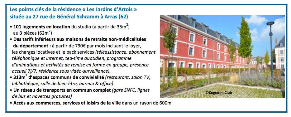 « Avoir un cadre de vie plus attrayant, c’est la première raison qui incite un senior à déménager. C’est pourquoi la localisation de nos résidences est le premier critère dans notre cahier des charges. Nous n’avons pas choisi Arras par hasard. C’est une ville dynamique, proche de ses habitants, avec un patrimoine historique très riche. Nous sommes fiers de proposer à nos résidents ce cadre de vie si prestigieux, dans un environnement rassurant, empreint d’histoire et tourné vers l’avenir », explique Jérôme Navarre, Directeur Général de Cogedim Club®.