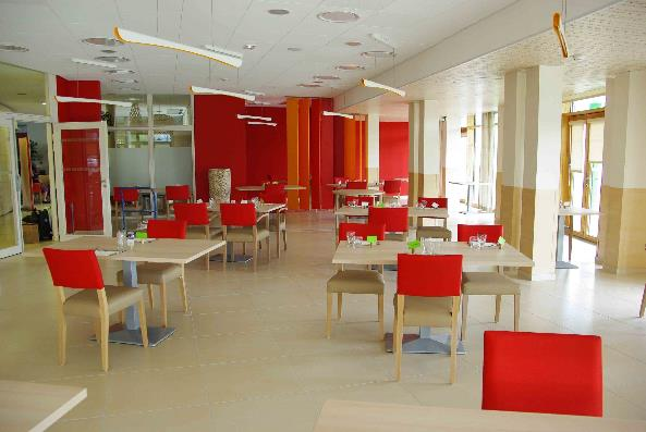 Dans le lobby, le soleil éclaire la résidence par le biais de grandes baies vitrées. La salle à manger aux couleurs vives et contrastées dans des tonalités d’oranger, de rouge et de beige clair insuffle du dynamisme aux résidents.