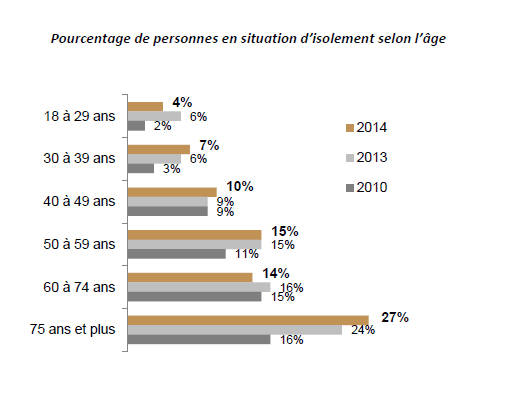 Parmi toutes les générations, celle des 75 ans et plus est la plus concernée par la montée des solitudes en France : aujourd’hui, 1 personne âgée sur 4 est seule (27% en 2014 contre 16% en 2010).