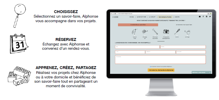 La plateforme Web met en relation un « Curieux » (un internaute) avec un Alphonse, en fonction de ses envies, ses besoins et de l’endroit où il se trouve. Le cours peut avoir lieu chez l’Alphonse ou au domicile de l’apprenant.