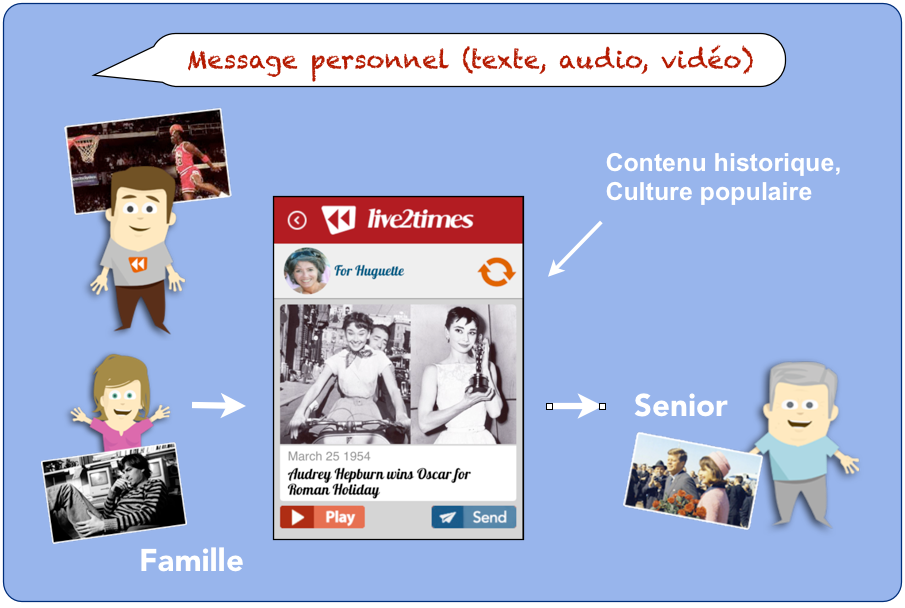 Live2times est une application destinée en priorité aux seniors. Elle permet de « connecter les générations autour de grands moments de la culture populaire ».