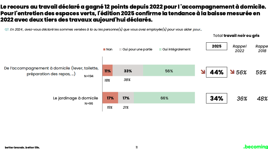 - Selon cette étude sur le travail non déclaré : 56 % des prestations d’aide à domicile déclarées en 2025, +12 points depuis 2022