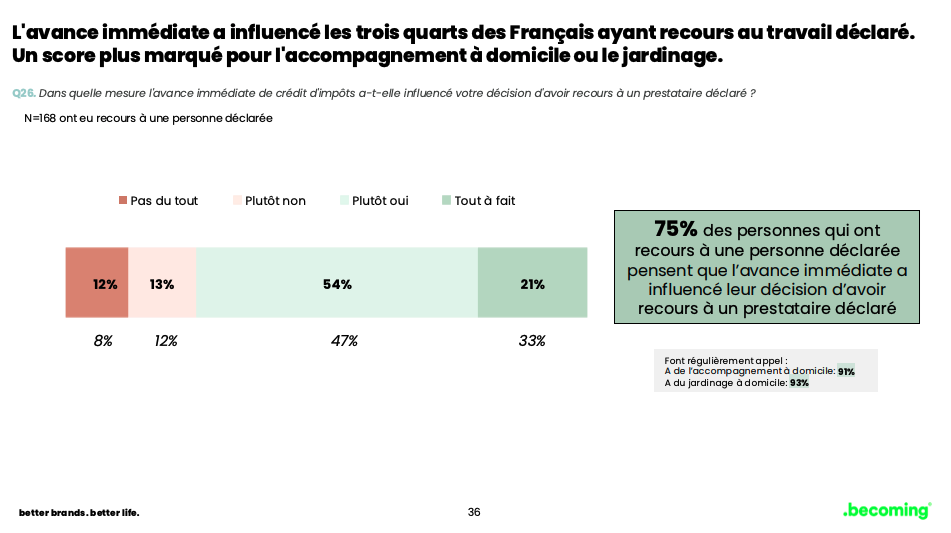 Sans cette mesure, la moitié des foyers interrogés disent qu’ils auraient opté pour une autre solution, soit en recourant à un proche ou un prestataire non déclaré, soit en renonçant simplement au service. Ce constat souligne à quel point le maintien du crédit d’impôt et de son avance immédiate est vital pour l’équilibre économique et social du secteur.