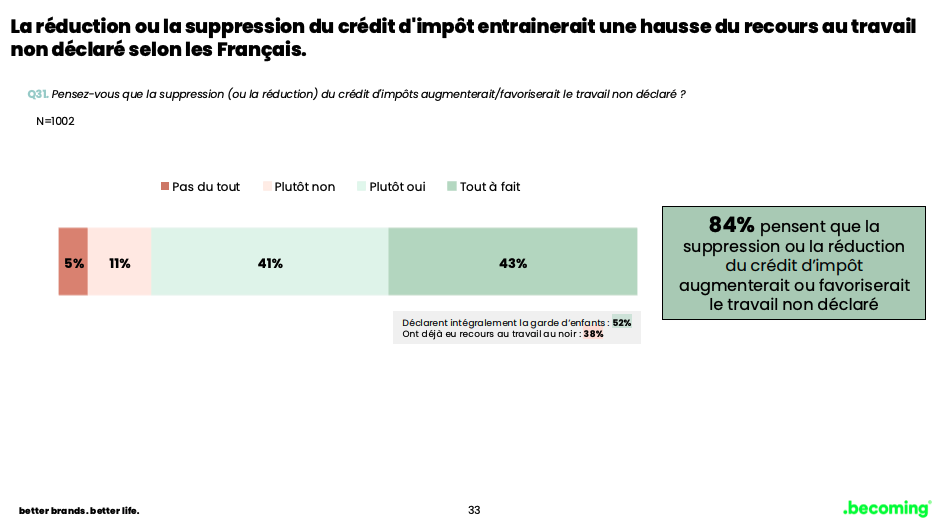L’étude montre que l’amélioration du taux de déclaration dans l’aide à domicile est fragile. Une baisse du crédit d’impôt (de 50% à 40% par exemple), pourrait provoquer un recul rapide de cette dynamique : 41% des clients actuels réduiraient les heures et 23% renonceraient complètement au service. La suppression pure et simple du crédit d’impôt entraînerait, selon 84% des Français, une explosion du travail non déclaré.