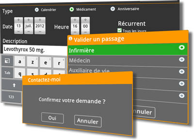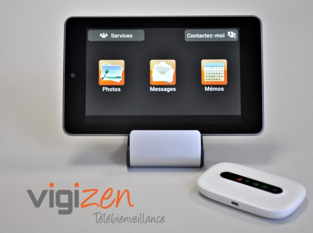 Connectée à Internet par le Wifi ou la 3G, la tablette tactile de Vigizen présente une interface intuitive qui n’intimidera pas les plus âgés. Ceux-ci n’auront aucun mal à naviguer entre le volet « lien social », qui permet d’échanger des photos et des messages via un serveur utilisé exclusivement par leurs proches, et le volet « gestion de la vie », auquel peuvent également accéder leur famille et les professionnels chargés de leurs soins à domicile. Ces derniers pourront inscrire dans l’onglet « télégestion » l’heure et la durée de leurs visites et le type d’aide apporté. Des informations dont l’accès peut être limité aux contacts familiaux ou professionnels de l’utilisateur, pour une parfaite confidentialité. Dans le même onglet, le senior pourra par ailleurs créer des mémos et configurer des alertes lui rappelant la date d’un rendez-vous médical, l’heure de prise d’un médicament ou encore l’anniversaire d’un proche.