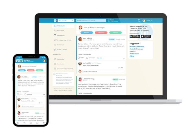 Premier réseau social de proximité, Ensembl’ favorise l’entraide entre voisins et permet aux acteurs de la ville de lutter contre l’isolement des populations. Le site internet et son application permettent aux habitants et aux acteurs de la vie locale (collectivités, associations, commerces, bailleurs, établissements seniors, résidences étudiantes, promoteurs, etc.) de partager des informations et d’échanger des services.