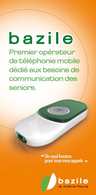 Bazile, le premier opérateur mobile français dédié aux seniors et aux personnes âgées Alors que le mobile s’impose comme un moyen technologique créateur de lien social, seulement 37% des plus de 75 ans en sont équipés… Le marché est porteur, et la société Bazile Télécom, lauréat des Trophées du Grand Age 2009, renforce son positionnement sur ce secteur en concluant un accord d’opérateur mobile virtuel (MVNO) avec Orange et en devenant ainsi le premier opérateur mobile français dédié aux seniors, aux malvoyants et aux personnes en situation de handicap. Bazile Telecom a conçu une solution de téléphonie mobile très simple, associant un téléphone mobile à un seul bouton et un service humain de téléphonie assistée disponible 24h/24. L’opérateur propose ainsi depuis le 1er Juillet 2009 une offre unique regroupant :