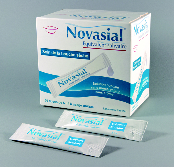 Conditionné sous forme de doses individuelles le Novasial® une fois dispersé dans la bouche forme un film de microbulles qui tapisse, hydrate et protège les muqueuses. Ce film permet à la langue de glisser sur le palais sans frottements ni irritation. Les patients peuvent effectuer plusieurs prises par jour sans risque, en fonction des besoins (avant les repas, la prise de parole ou au coucher, par exemple).