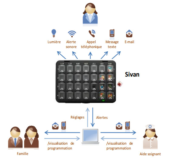 Cumulant des technologies de téléassistance, télésurveillance, télémonitoring et télécontrôle, le pilulier Sivan est en mesure d’appeler le patient ou ses proches, de leurs envoyer des SMS et des e-mails pour les alerter en cas d‘oubli.