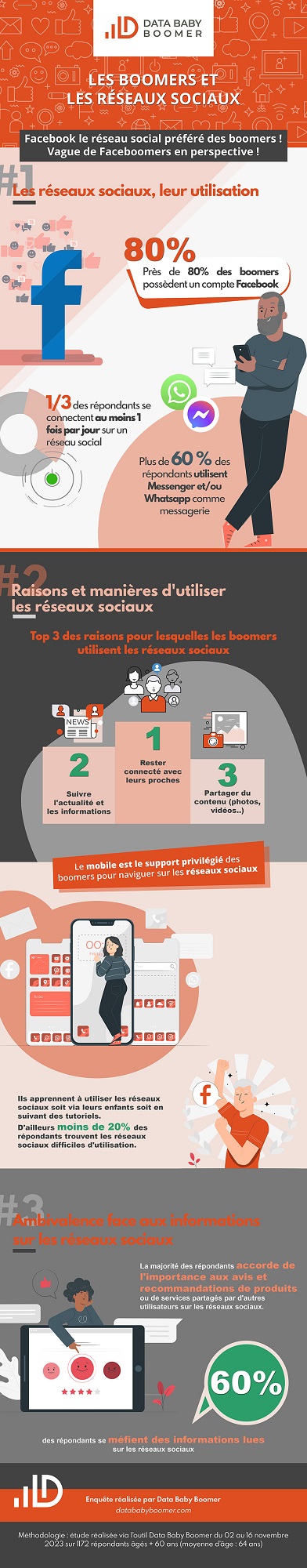 L’enquête réalisée par Digital Baby Boomer révèle notamment que plus de 80 % des boomers possèdent un compte Facebook. D’après les questionnaires, 1/3 des répondants se connectent au moins 1 fois par jour sur un réseau social.