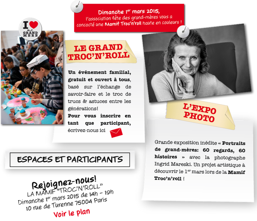 La fête des grands-mères sera également l’occasion de revoir la « Mamif Troc’n’roll », événement familial et intergénérationnel destiné à échanger savoir-faire, trucs et astuces : elle se déroulera le 1er mars de 14 heures à 19 heures au 10, rue de Turenne, à Paris. Grand’Mère, qui a célébré ses 60 ans en 2014, y révèlera une exposition appelée « Portraits de grand-mères : 60 regards, 60 histoires ». La « Mamif Troc’n’roll » est organisée par l’association fête des grands-mères.