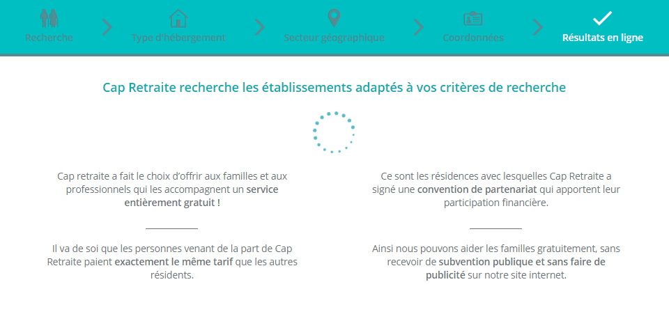 - Par la suite, Cap Retraite affiche une liste des maisons de retraite correspondant aux choix des internautes, ainsi qu’un récapitulatif de la demande par mail pour choisir la meilleure résidence possible.
