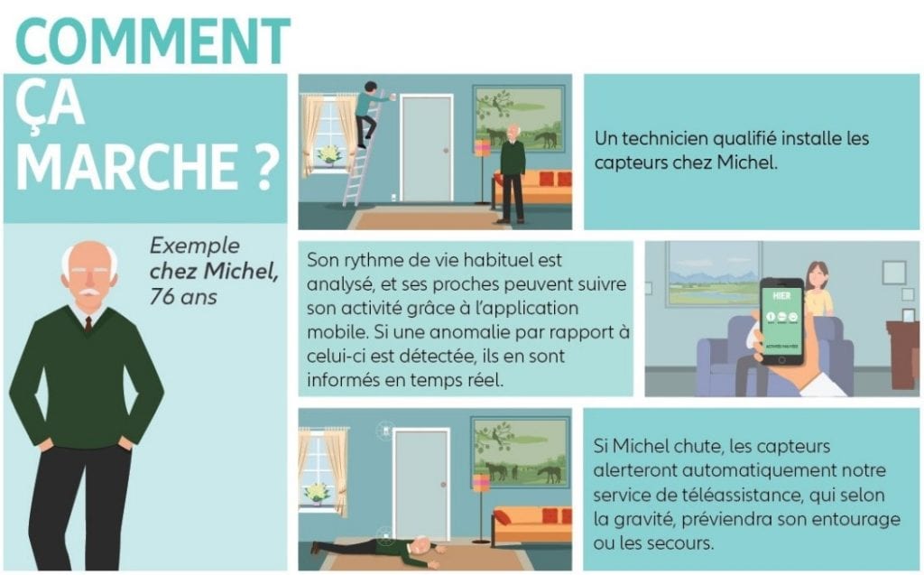 Une solution de téléassistance à domicile innovante et discrète avec des capteurs sans fil installés au sein du domicile qui analyseront le rythme de vie du bénéficiaire et décèleront automatiquement les anomalies.