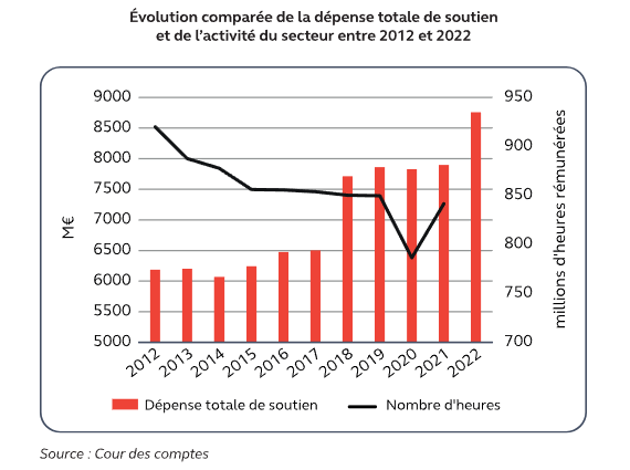 Depuis, la dépense publique consacrée à ces activités a continué à augmenter avec une hausse de plus de 40 % sur dix ans. Cette hausse contraste avec la stagnation de l’activité observée depuis 2015. Le coût des aides spécifiques s’élève à 9,38 € par heure travaillée, soit un montant proche de celui du Smic horaire brut, en hausse de 29 % en euros constants sur dix ans.