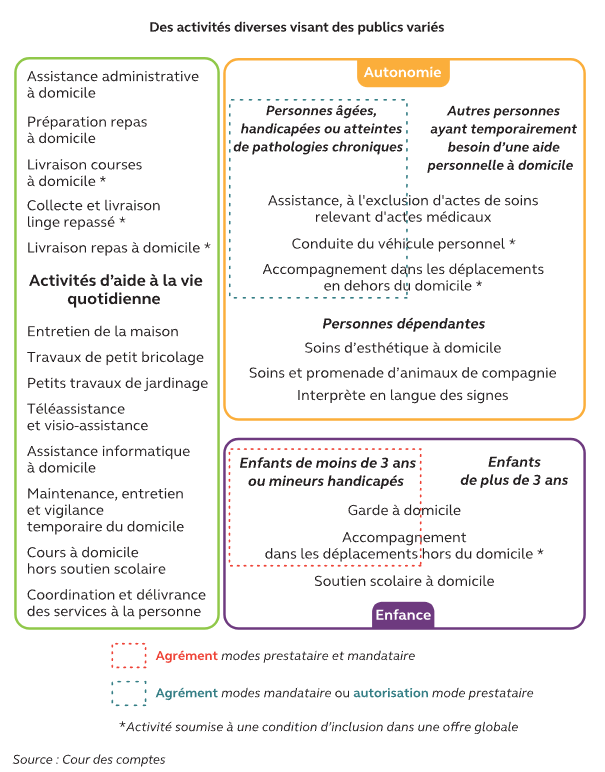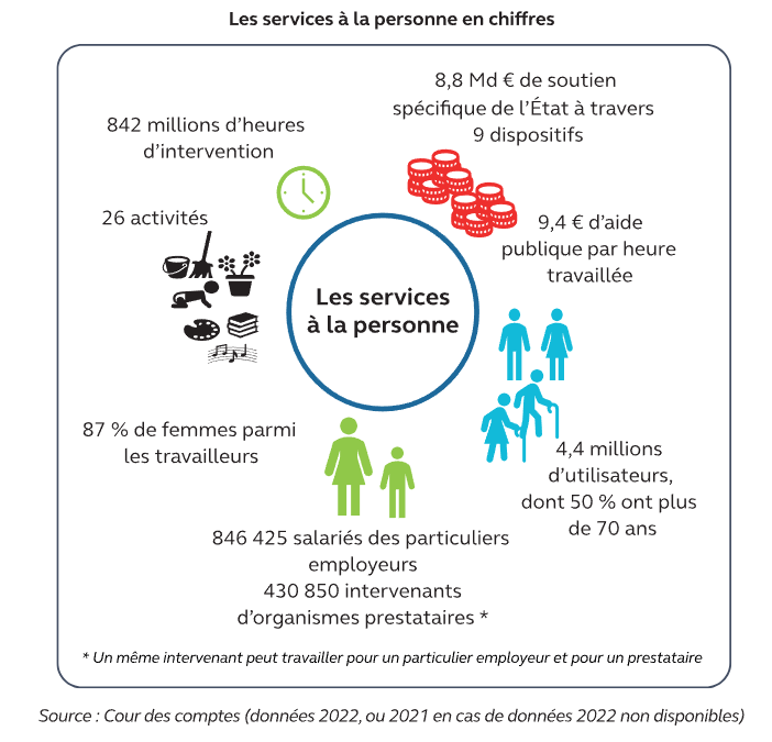 En 2022, les services à la personne ont représenté plus de 8,8 Md€ de soutiens spécifiques aux 4,4 millions d’utilisateurs qui y ont eu recours. Ils regroupent 26 secteurs de nature très diverse, relevant de besoins sociaux essentiels comme de services de la vie quotidienne. Ces activités bénéficient de soutiens publics en développement régulier, reposant principalement sur un crédit d’impôt en faveur de l’emploi direct ou indirect d’un salarié à domicile, généralisé en 2018. Dans un contexte sous tension, la Cour de Comptes a examiné ces soutiens de l’État sous l’angle de « la qualité de la dépense publique ». Elle propose « des perspectives d’évolution qui, sans dégrader la réalisation des principaux objectifs de ces soutiens, sont porteuses d’économies ».