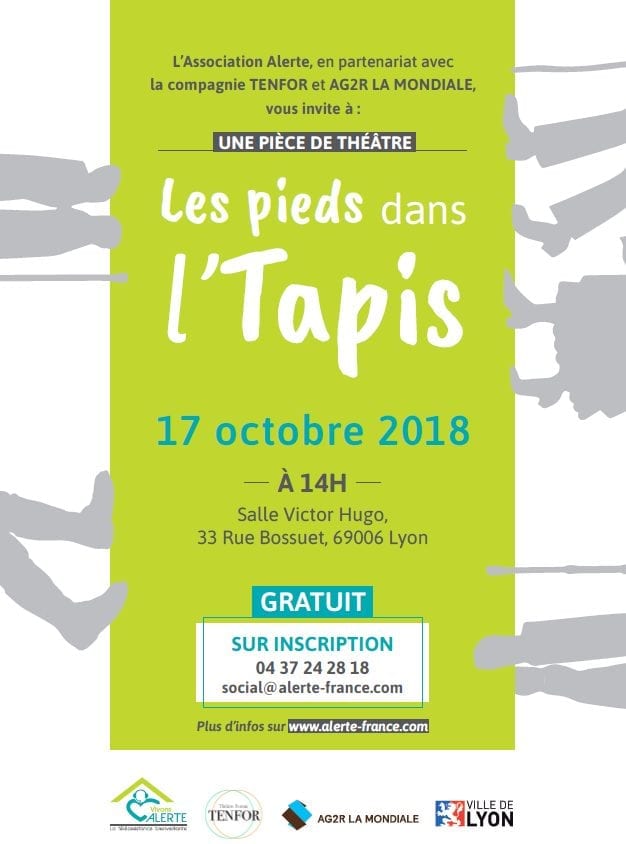 L’Association Alerte en partenariat avec la compagnie TENFOR et AG2R LA MONDIALE présente « Les Pieds dans l’tapis », une pièce de théâtre participative pour les seniors et pour leur famille. Cet événement est tout public et gratuit. Il aura lieu le mercredi 17 octobre 2018 à Lyon. Réservez vos places dès à présent !