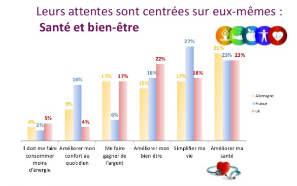 Leurs attentes sont principalement ciblées sur eux-mêmes (santé et bien-être). En effet, à la question « D’une manière générale, qu’attendez-vous d’un nouveau produit ou d’un nouveau service ? » Les Français sont majoritaires à répondre « Simplifier ma vie », « améliorer ma santé » ou encore « améliorer mon bien-être ».