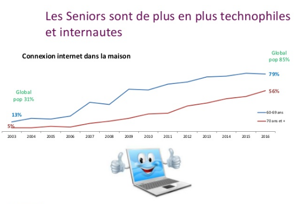Les seniors sont de plus en plus technophiles et internautes. En effet, l’étude donne des chiffres frappants : les seniors de 70 ans et plus étaient équipés d’une connexion Internet à domicile à hauteur de 5% en 2003 contre 56% aujourd’hui ; sur le même schéma, les seniors âgés de 60 à 69 ans, étaient quant à eux 13% à disposer d’une connexion Internet en 2003 contre 79% en 2016.