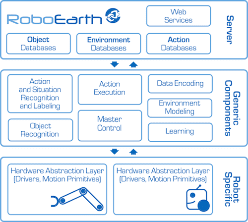 Chaque robot connecté à Roboearth pourra y stocker des informations qu’il aura collectées, des informations complémentaires pourront également être stockées par des humains. Les autres robots et machines connectés au cloud auront accès à ces informations et pourront s’en servir pour exécuter des tâches. Ils apprendront les uns des autres. RoboEarth-Diagram