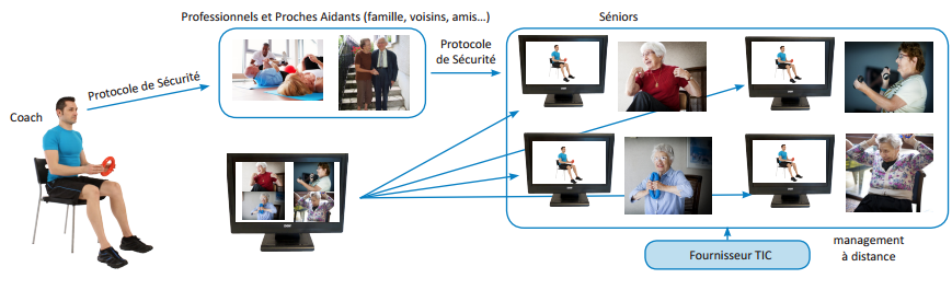 Chaque séance est organisée par petits groupes de quatre personnes, situées chacune dans son habitat. Elles participent à la même séance, dirigée à distance par un coach, en utilisant un système de visioconférence multipoint.