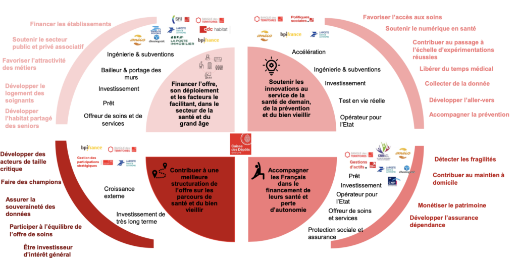 La feuille de route implique l’ensemble des entités du Groupe : Direction des politiques sociales, Banque des Territoires, CDC Habitat, Groupe La Poste, SFIL, Bpifrance, CNP Assurances, et emeis. Ensemble, elles interviennent sur tout le parcours de santé, du soin de ville à l’EHPAD, en passant par l’hospitalisation à domicile, la prévention, et le numérique en santé.