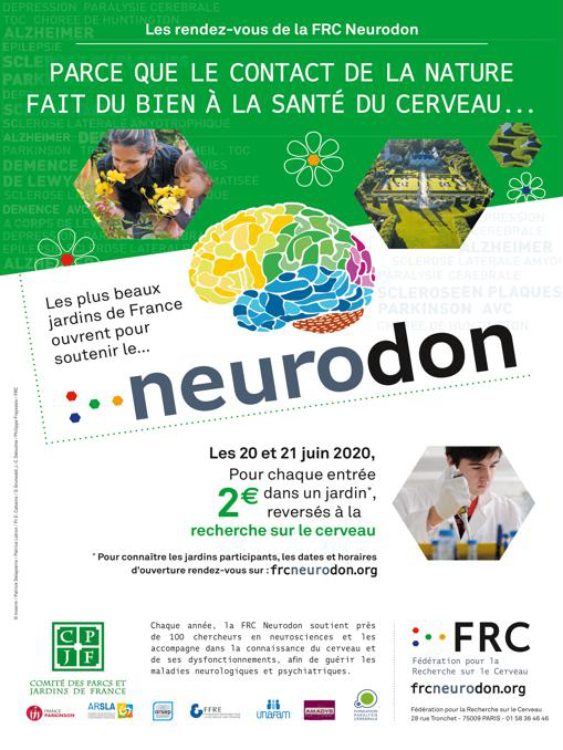 Parce que le contact avec la nature est bon pour la santé du cerveau, la Fédération pour la Recherche sur le Cerveau s’associe avec le Comité des Parcs et Jardins de France pour le Neurodon. Une centaine de parcs et jardins d’exception, ouvriront leurs portes aux visiteurs le week end du 20 et 21 juin 2020 afin d’organiser une collecte nationale au profit de la Recherche sur le Cerveau.