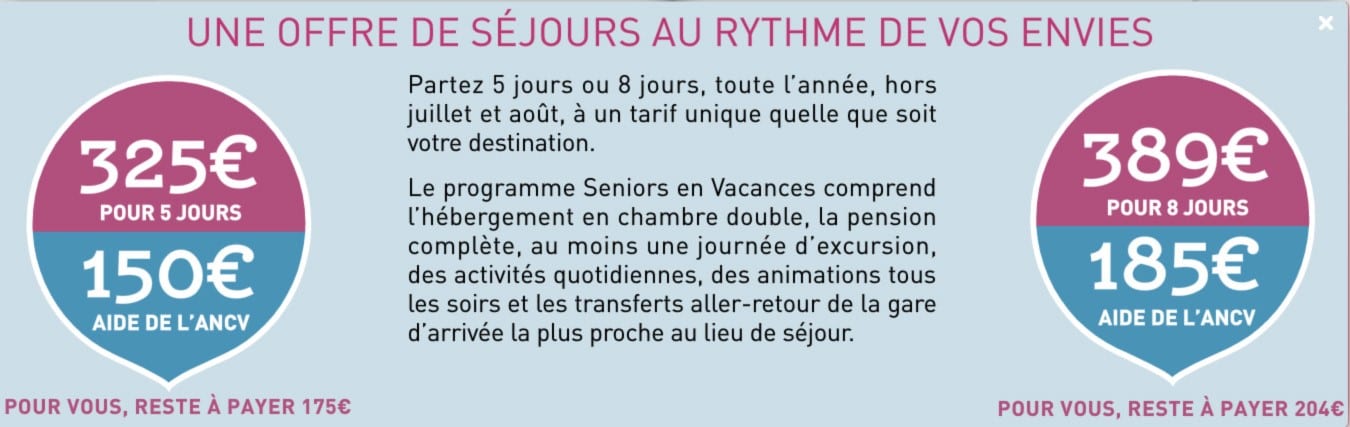 Seniors en Vacances propose 154 destinations partout en France, à la mer, à la campagne ou à la montagne, pour un budget de 325 € par personne pour 5 jours et 389 € pour 8 jours. Près de 50% du coût du séjour est pris en charge par l’ANCV pour tous les retraités âgés de 60 ans et plus, résidant en France et non imposables avant déductions fiscales. En 2014, 63% des seniors ont bénéficié des aides de l’ANCV.
