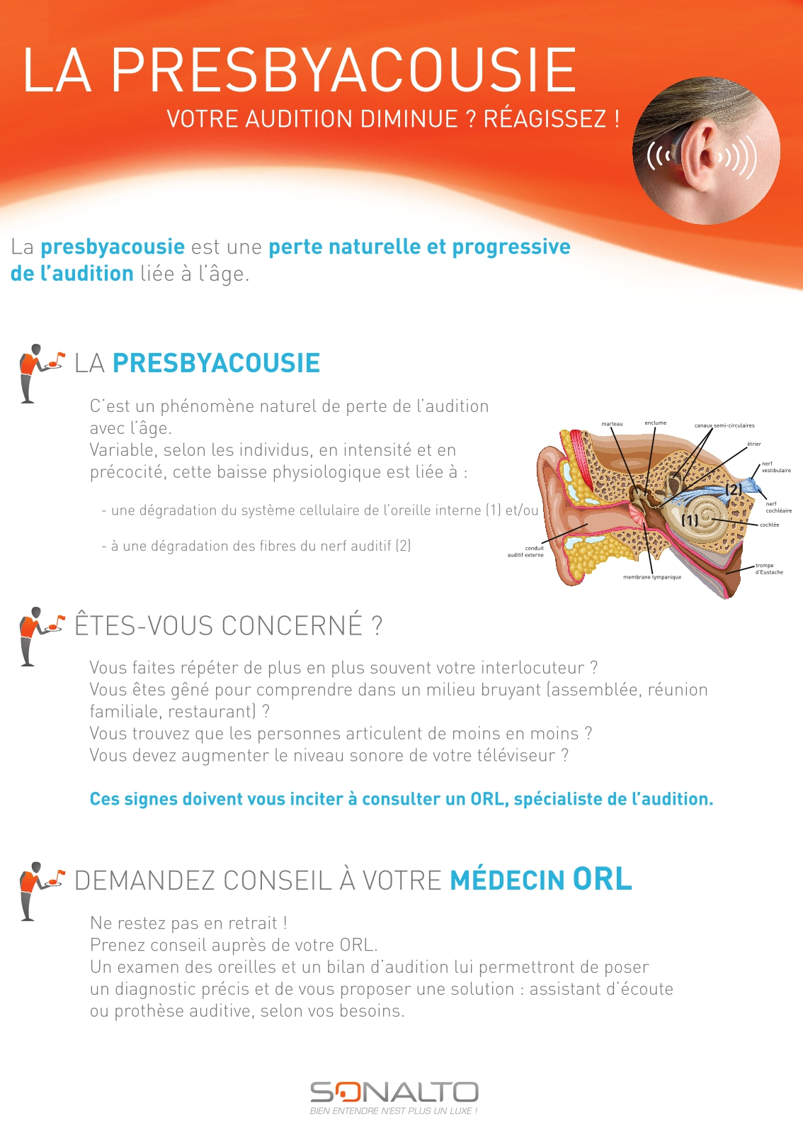 Sonalto, première entreprise 100% dédiée à la presbyacousie débutante, a décidé de lancer une campagne nationale d’information autour de la perte naturelle de l’audition. Le phénomène de la presbyacousie, comme la presbytie, touche 2/3 des personnes de plus de 50 ans. Il faut donc informer, mais surtout dédramatiser cette gêne et la démarche d’appareillage.