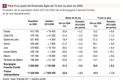 La population du Doubs, du Territoire de Belfort et de la Côte-d’Or est vouée à augmenter de manière significative, tandis que la déprise démographique devrait se poursuivre dans la Nièvre. Moins de jeunes, davantage de seniors, en particulier de personnes âgées de 75 ans ou plus, la structure par âge de la population pourrait se trouver modifiée dans tous les départements de la région.