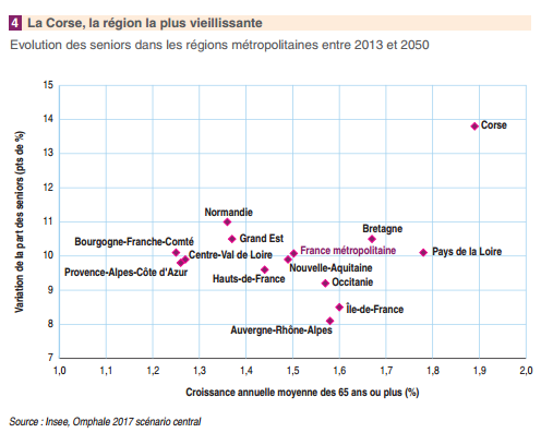 La croissance du nombre de seniors serait plus élevée qu’au niveau national : + 1,8 % en moyenne annuelle, contre + 1,5 % en France métropolitaine. L’augmentation du nombre de personnes âgées serait accentuée par l’excédent migratoire, comme dans la plupart des autres régions littorales. Au total, la région compterait 610 000 habitants supplémentaires âgés de 65 ans ou plus à horizon 2050.