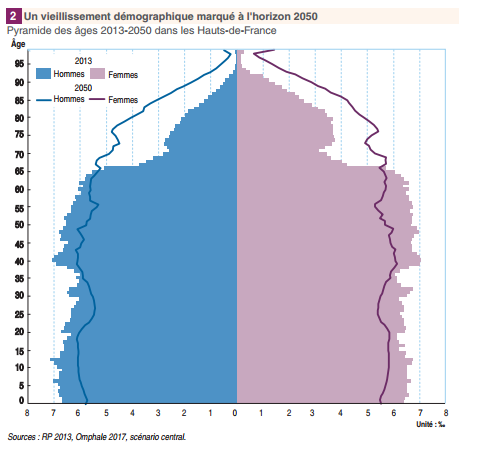 Entre 2013 et 2050, seule la population des seniors (65 ans ou plus) devrait augmenter dans la région. Avec 640 000 personnes supplémentaires, soit une hausse de 1,4 % par an en moyenne (contre + 1,5 % en moyenne France entière), les Hauts-de-France abriteraient 1,6 million de personnes de 65 ans ou plus en 2050, contre 920 000 aujourd’hui.